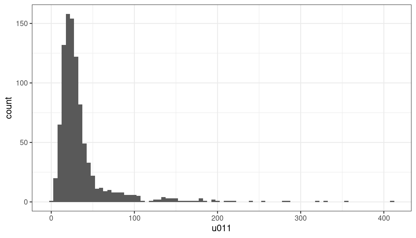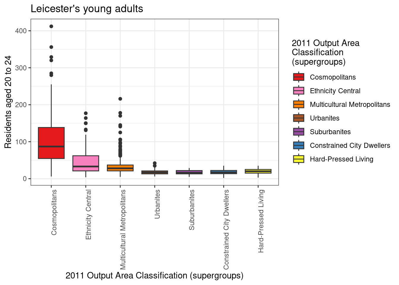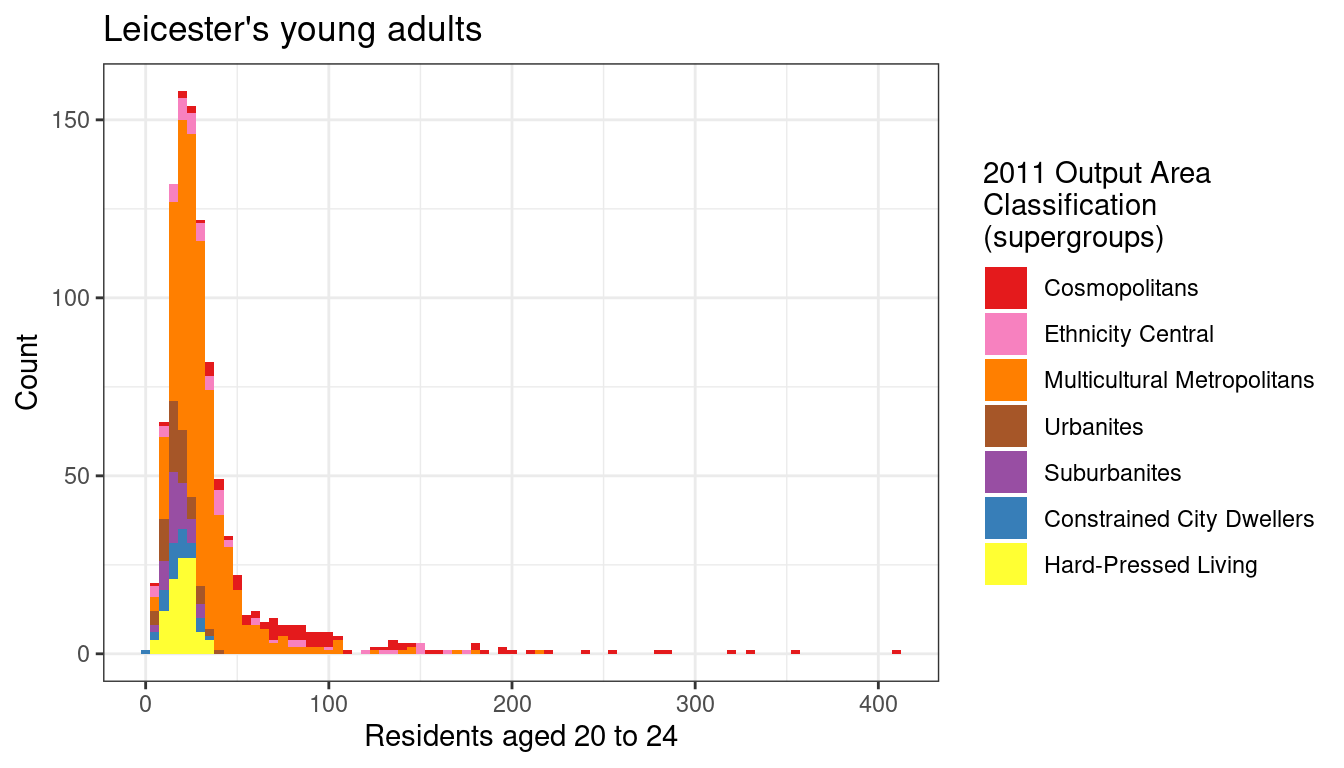 This chapter showcases an exploratory analysis of the distribution of people aged 20 to 24 in Leicester, focusing on the u011 variable from the 2011 Output Area Classification (2011OAC) dataset introduced previous chapters.