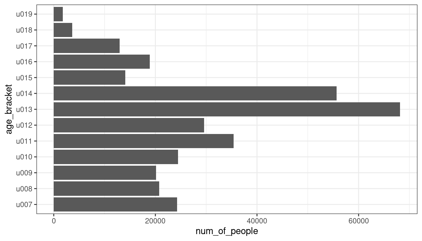 The first step is to summarise the total amounts for each one of the columns from u007 (Age 0 to 4) to u019 (Age 90 and over). The code below uses the dplyr verb across to apply the same summarise function sum across all columns from u007 to u019. The table is then pivoted to longer so that each age bracket is an entity of the table, and the number of people in the age bracket is the attribute to be visualised – if the procedure is unclear, try to execute it step-by-step (summarise first, then pivot) to see the different stages.