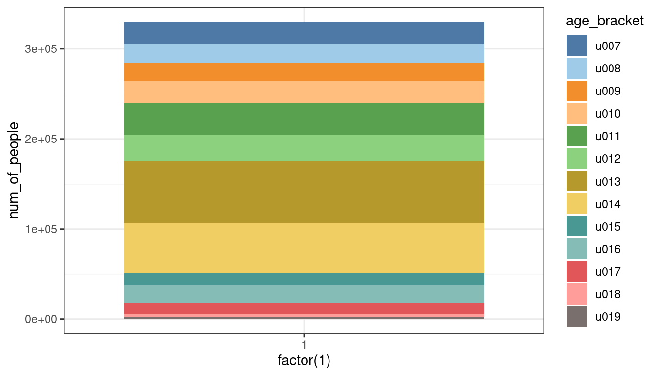 To better observe how those values compare as proportions of the overall total, the visualisation can be transformed into a stacked bar chart, compounding all area marks into one single bar. The number of people can be moved from the x to the y axis. The age bracket can be moved from the y axis to the fill visual variable.