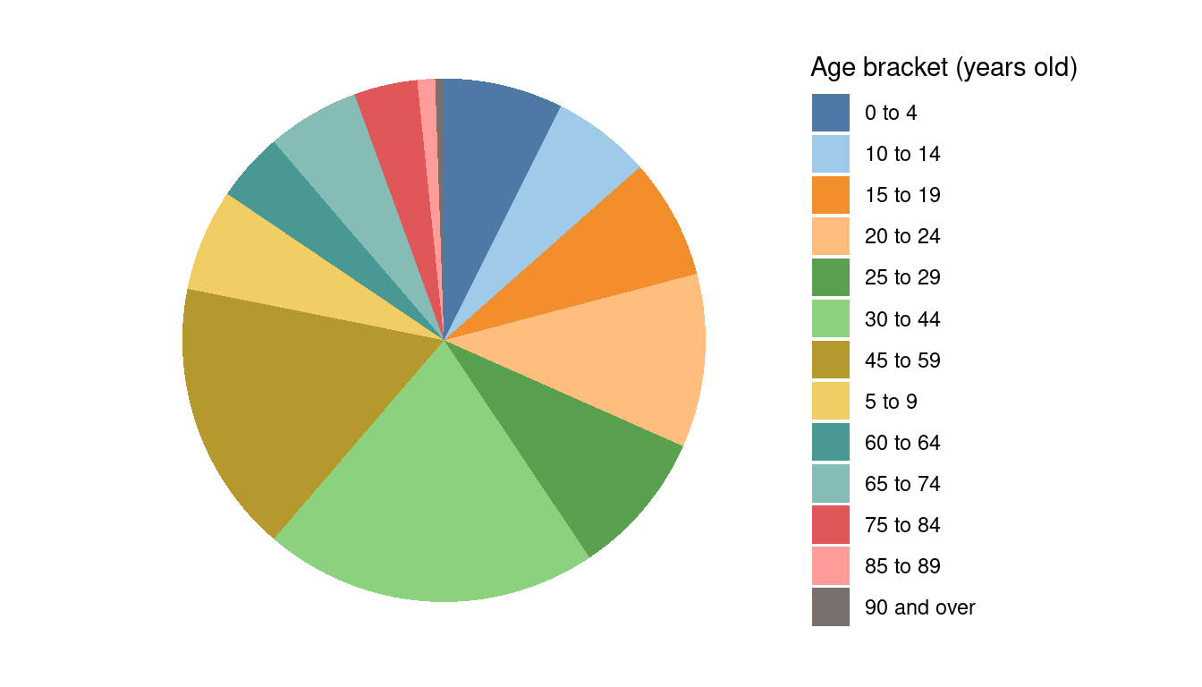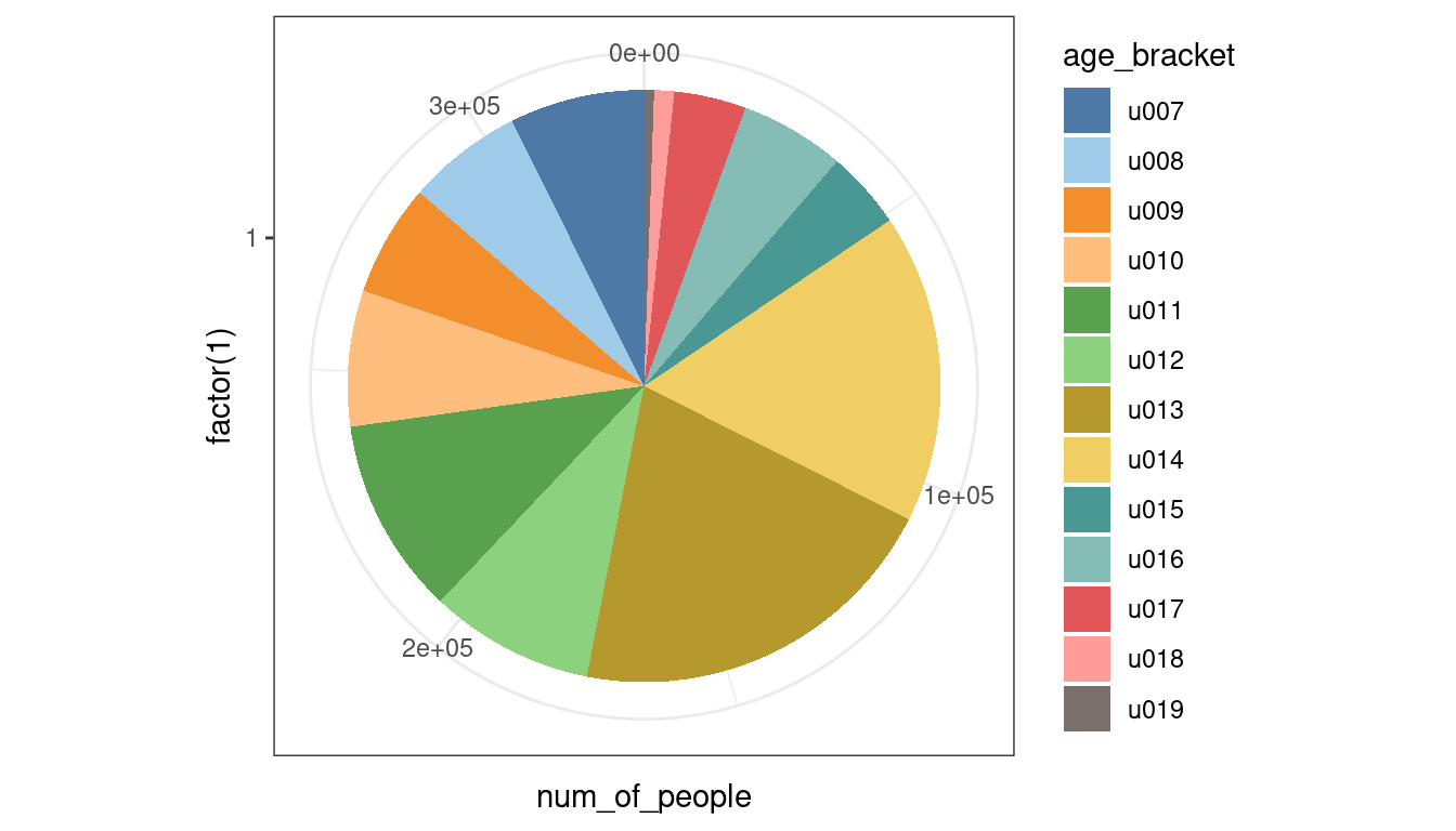We can then use the theme_minimal theme and set a few of the theme elements to element_blank to clean-up the chart. We can also rename the age brackets columns ahead of the pivot and change the order of the slices using direction = -1 to make the chart readable.