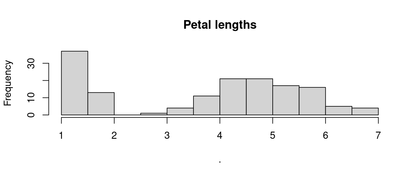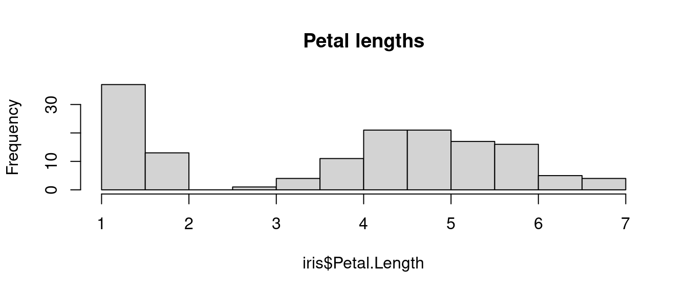 hist(iris$Petal.Length, main = "Petal lengths")