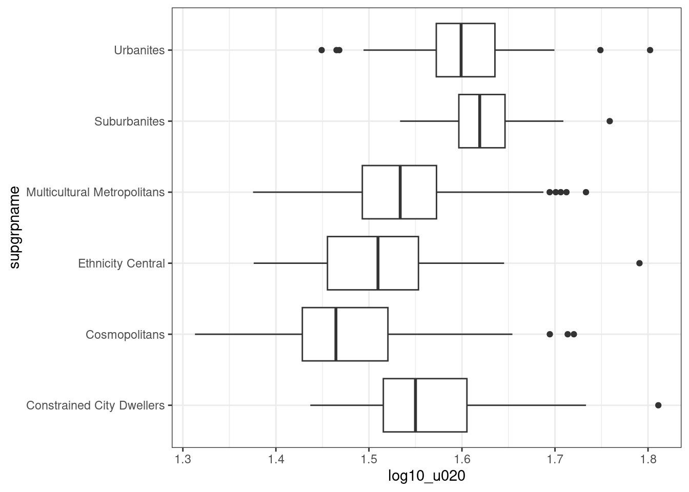 The plot above illustrates how the variable related to commuting via foot, bicycle or public transport in Leicester is very skewed. The same applies to the variables related to housing type. At the same time, the presence of Caravan or other mobile or temporary structure seems minimal. As such, we can attempt to remove the latter, and “un-skew” the rest using a logarithmic function. As there are cases in which at least one of the variables has minimum zero, we can take this example to explore the use of the function \(log_{10}(x+1)\) – which shift the logaritmic function to the left, so that the result is zero for \(x=0\).