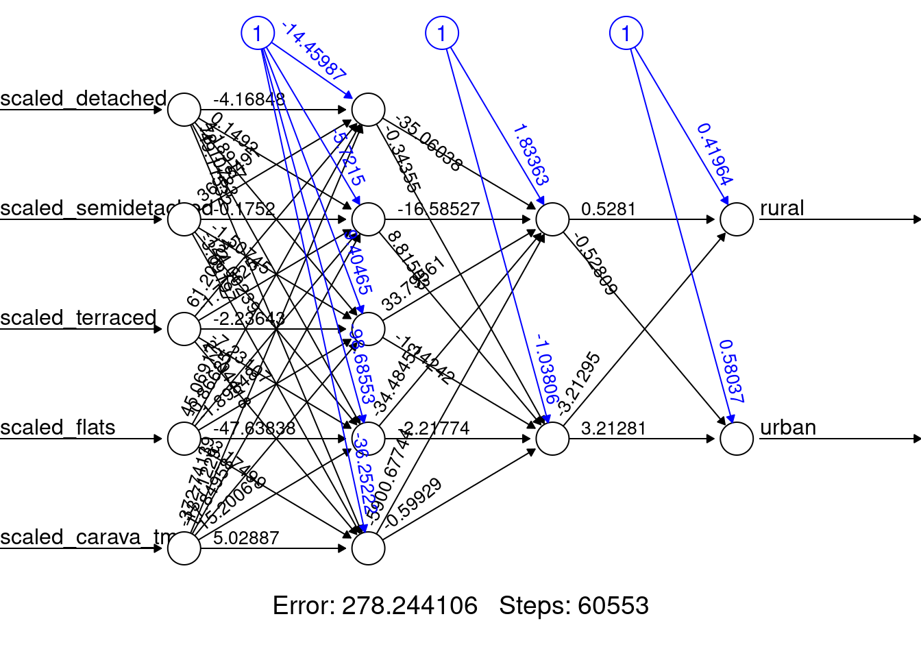install.packages("neuralnet")The examples use the same data seen in previous chapters, but for the 7 LADs in Leicestershire outside the boundaries of the city of Leicester: Blaby, Charnwood, Harborough, Hinckley and Bosworth, Melton, North West Leicestershire, and Oadby and Wigston. Those data are loaded from the 2011_OAC_Raw_uVariables_Leicestershire.csv. The second part of the code extracts the data of the Rural Urban Classification (2011) from the compressed file RUC11_OA11_EW.zip, loads the extracted data and finally deletes them.